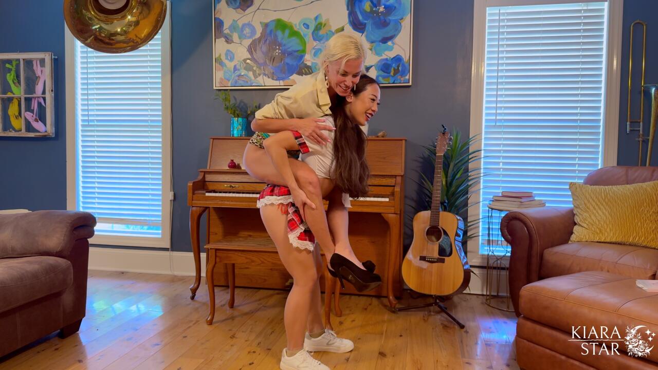 Kiara Star is at her piano lesson with teacher Tatiana Steele, but she has other plans for their lesson. She decides to lift her teacher right off of her heels and carry her around the studio! Kiara lifts Tatiana in an over the shoulder carry and piggy back. Tatiana even wants a turn and she lifts Kiara too.